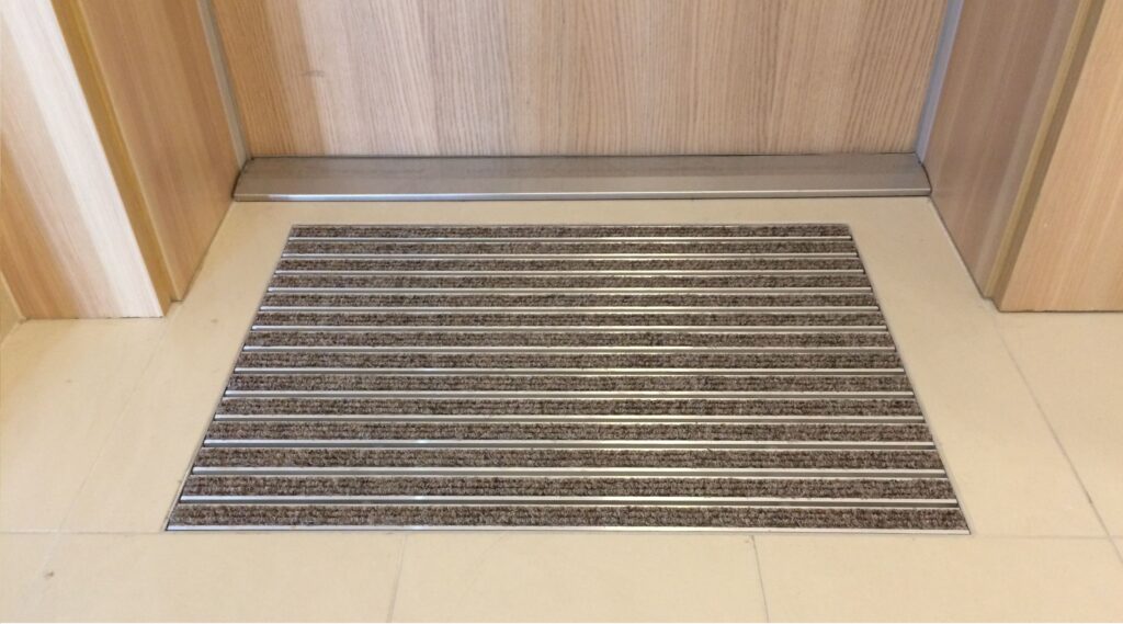 - wymiary i dopasowanie: wycieraczka powinna idealnie pasować do powierzchni przed windą, aby skutecznie zatrzymywać brud. Za mała nie spełni swojej funkcji, za duża może utrudniać swobodne otwieranie drzwi windy i utrudni poruszanie się zwłaszcza osobom o mniejszej sprawności fizycznej (np. poruszającym się na wózku czy o kulach);